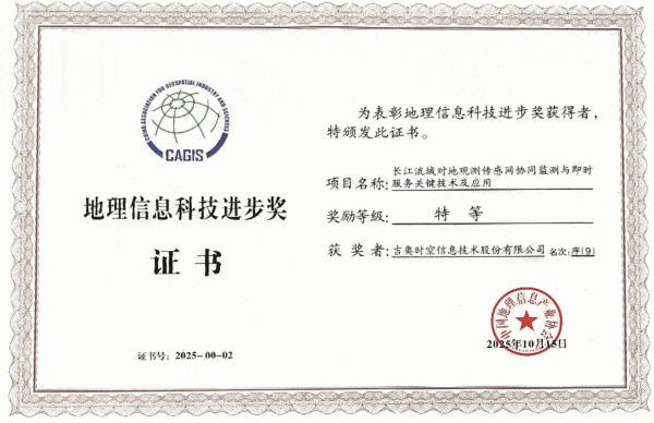 在地理信息科技进步奖评选中,吉奥时空共获得1项特等奖,1项一等奖,2项二等奖。其中,“长江流域对地观测传感网协同监测与即时服务关键技术及应用”获评特等奖,“空地联合三维数据快速获取与智能化实体建模关键技术及应用”获评一等奖。